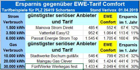 Zwei Drittel aller Stromkunden sind laut Bundesnetzagentur noch beim regionalen Versorger (bei uns EWE), ein Drittel sogar im besonders teuren Grundversorgungstarif (bei uns EWE Comfort). Aktuell lassen sich bei Strom 10% bis 20% sparen, bei Gas über 30% (siehe Tabelle). Ein typischer 2-Personen-Haushalt mit einem Verbrauch vom 3.500 kWh bei Strom und 20.000 kWh bei Gas kann durch Wechsel im Jahr etwa 550 € sparen. Das entspricht etwa 20% der Energiekosten.